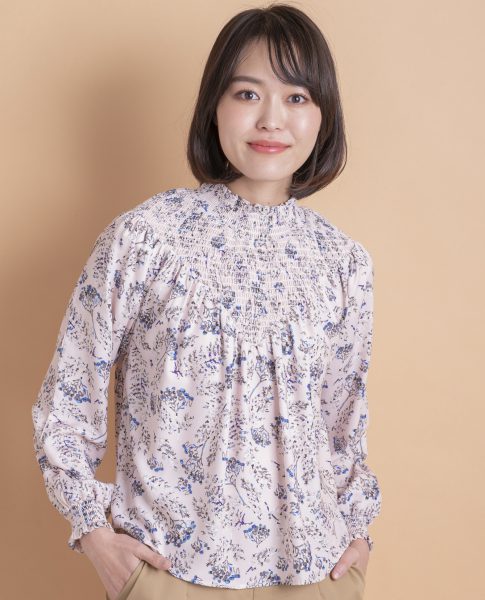 こちらも軽い着心地の春らしい花柄ブラウス。少し長めのチュニック丈です!