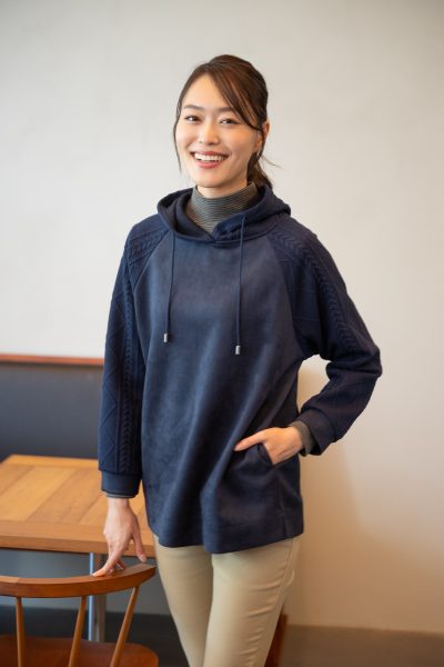 身頃にスエード調生地、フードと袖にケーブルニット調の生地を使用したプルパーカー。