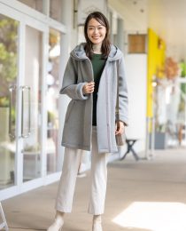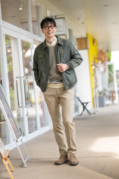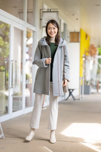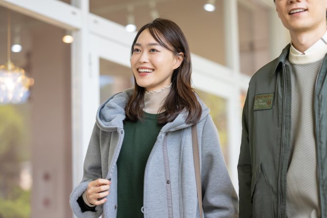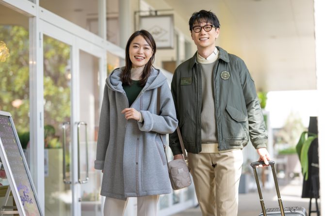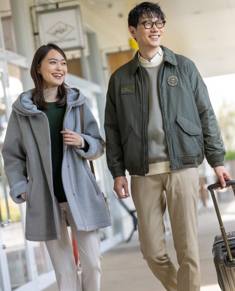 女性はグレーコート×カーキニット、男性はカーキの中わたフライトジャケットで、自然にリンクしつつそれぞれの個性も引き立ちます!