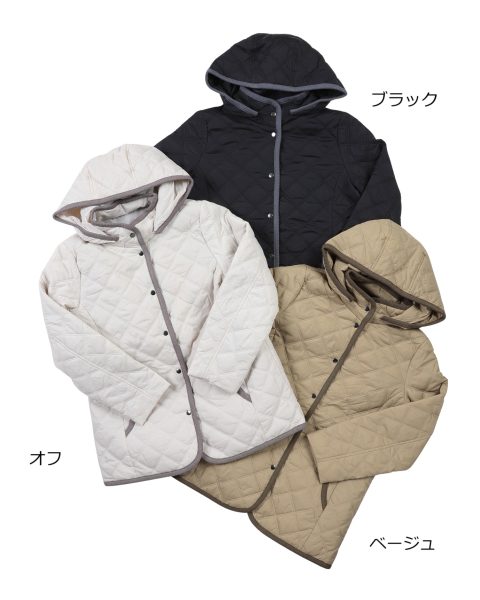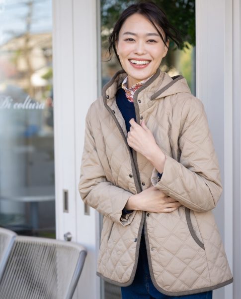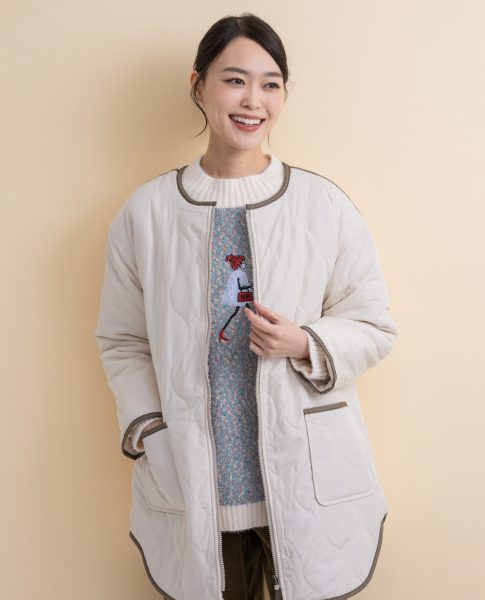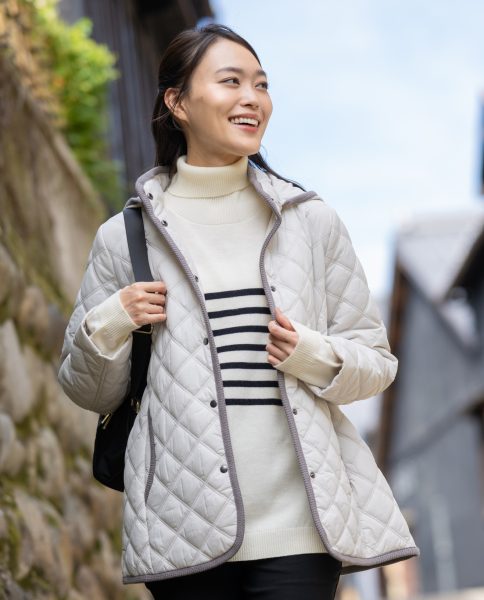 曲線を描く裾のラインが柔らかな印象の、キルトコート。