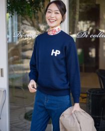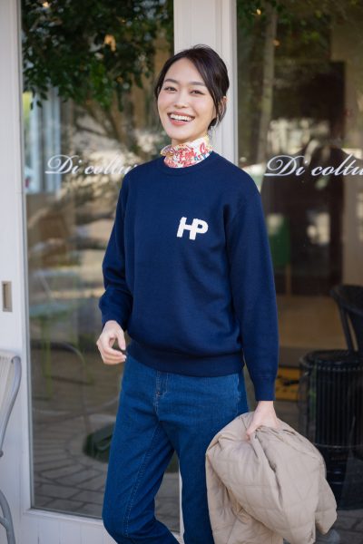 脱ぎ着の多いお出かけに向けて、HPのロゴがポイントのニット+花柄ハイネックなど、こだわりのあるアイテムを合わせました!