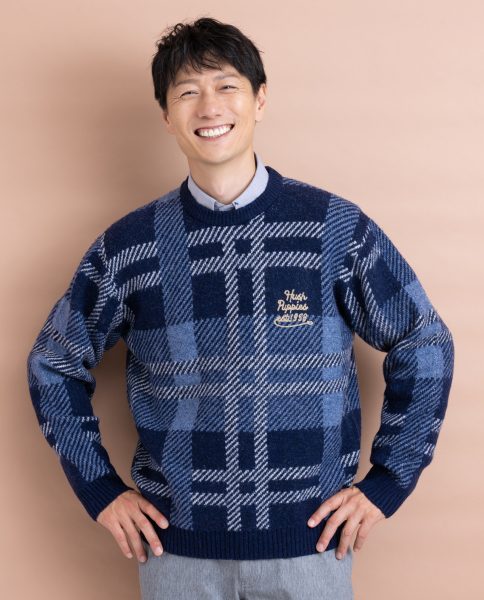 大胆なチェック柄に、ロゴのチェーン刺しゅうを施したデザインニット。