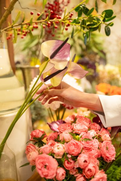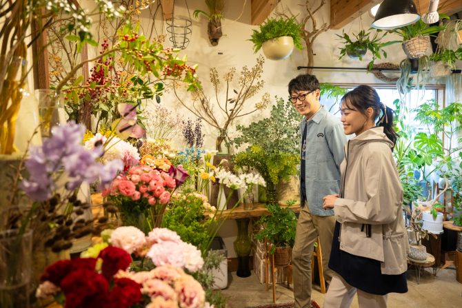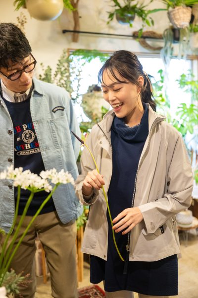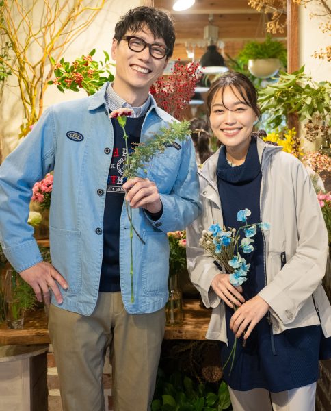 花屋を訪れる春のひとときに、すっとなじむ(*^^*)程よいペアスタイルに!