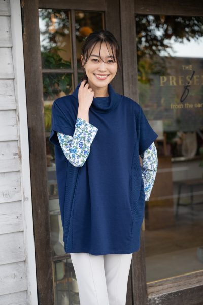 ネイビーのインナーは、リブ生地とカットソー生地を切り替えたチュニック。